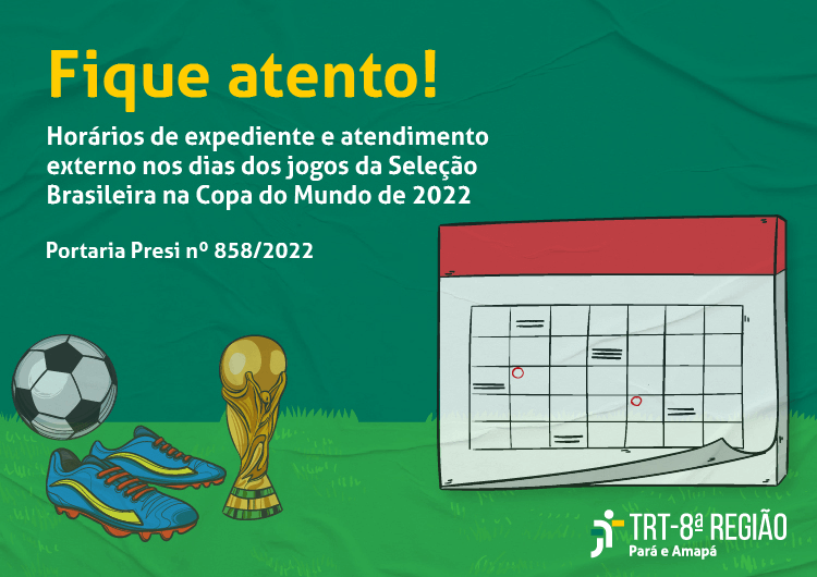 #ParaTodosVerem: Arte com fundo verde, ao lado esquerdo ilustração de chuteiras azuis, bola de futebol e taça da copa do mundo. Ao lado direito, a ilustração de calendário. Acima, alinhado à esquerda, o título em amarelo “Fique atento!”, abaixo em letras brancas "Horários de expediente nos dias dos jogos da seleção brasileira na copa do mundo de 2022”. No canto inferior direito, a logo do TRT da oitava região.